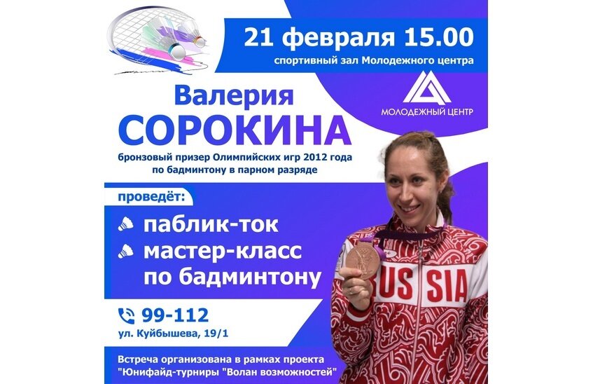 В пятницу, 21 февраля, в спортивной зале Молодежного центра чемпионка расскажет о своем пути в спорте, ответит на вопросы и проведет мастер-класс по бадминтону. Приглашают всех желающих. Вход свободный, обязательна сменная обувь. Начало встречи в 15:00.