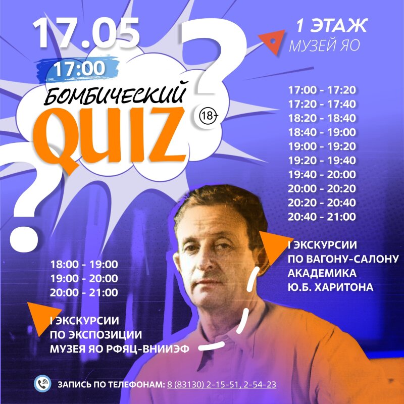 Экскурсии по вагону-салону Ю. Б. Харитона состоятся в 17:00, 17:20, 18:20, 18:40, 19:00, 19:20, 19:40, 20:00, 20:20 20:40.