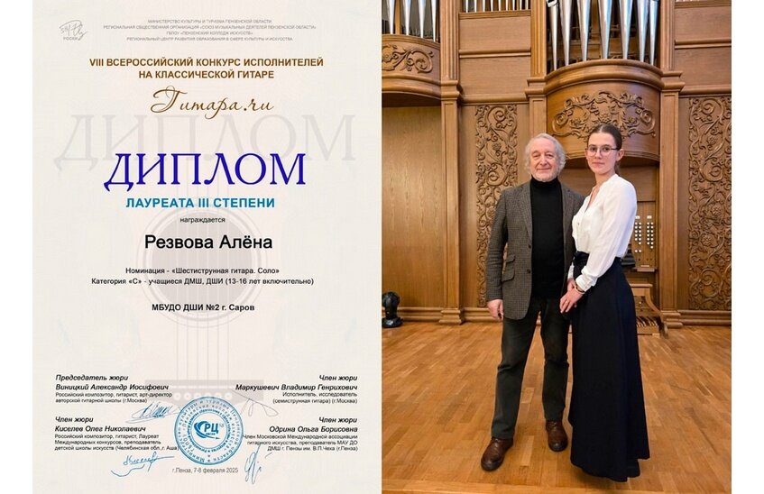 В конкурсе приняла участие Алена Резвова, ученица педагога Детской школы искусств № 2 Глеба Дементьева. Саровчанка удостоена звания лауреата третьей степени.