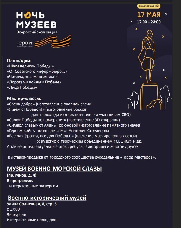 Площадками для их проведения станут Художественная галерея, Городской музей, Музей народной игрушки, Художественный салон, Архитектурная мастерская, библиотека имени Маяковского, Музей военно-морской славы, Военно-исторический музей, культурно-просветительский центр Саровского благочиния.