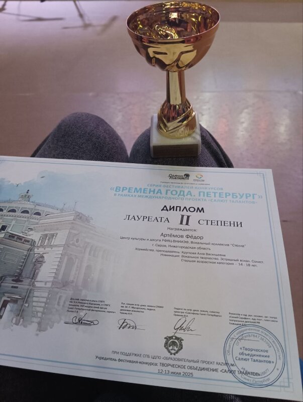 В номинации «Эстрадный вокал» одиннадцатиклассник саровского лицея № 15 Федор Артемов стал лауреатом второй степени.