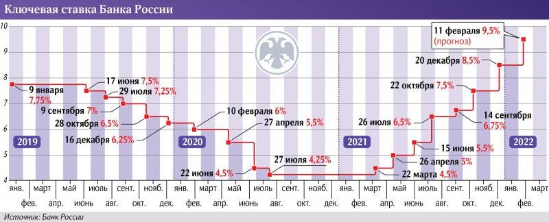 В «МКБ Инвестиции» допустили возможность повышения ключевой ставки еще на 0,5 п. п. на следующих заседаниях, если ситуация с инфляцией не стабилизируется. В базовом варианте Национального рейтингового агентства к лету 2022-го показатель может стать двузначным — 10,5 %, заявляла в интервью «Известиям» глава НРА Алина Розенцвет в январе.