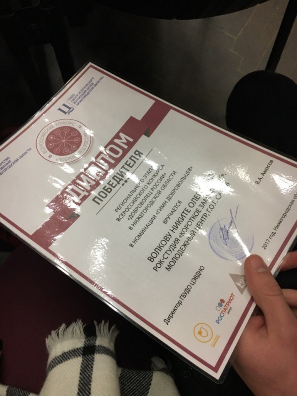 Победителем в номинации «Гимн добровольцев» стал Никита Волков из рок-студии «Короткое Замыкание» и городского клуба волонтеров «Инсайт» и прошел во всероссийский этап.