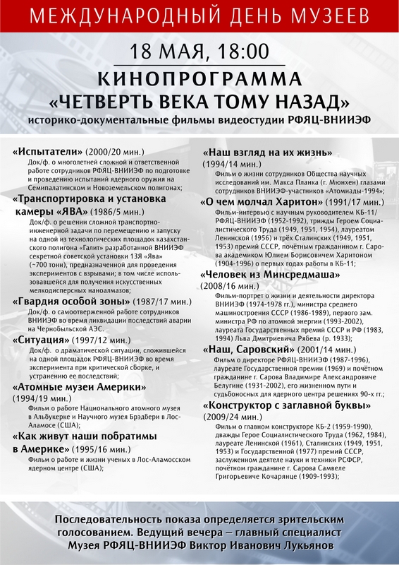 Музей ядерного оружия РФЯЦ-ВНИИЭФ приглашает всех желающих 18 мая в 18:00 на экскурсию по основной экспозиции музея, а также на просмотр и обсуждение историко-документальных фильмов из архива видеостудии ВНИИЭФ о наиболее ярких событиях и именах в истории ядерного центра.