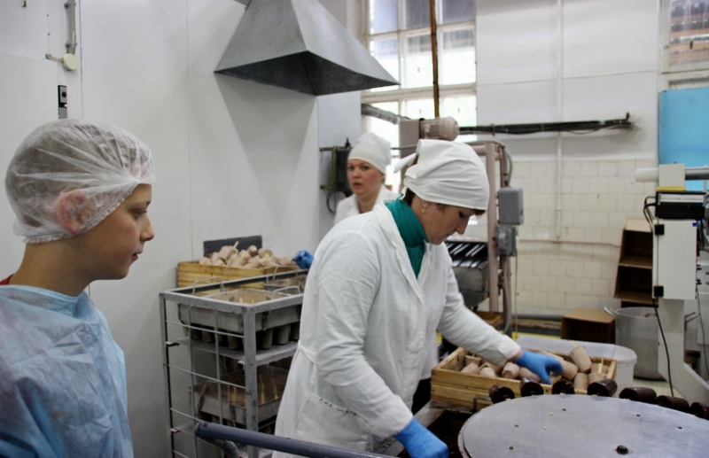 О процессе производства подробно рассказала техник-технолог Валентина Пешехонова, а сотрудники предприятия показали, как в эскимо попадает палочка, как мороженок укрывается глазурью, как запаивается упаковка и наносится дата.