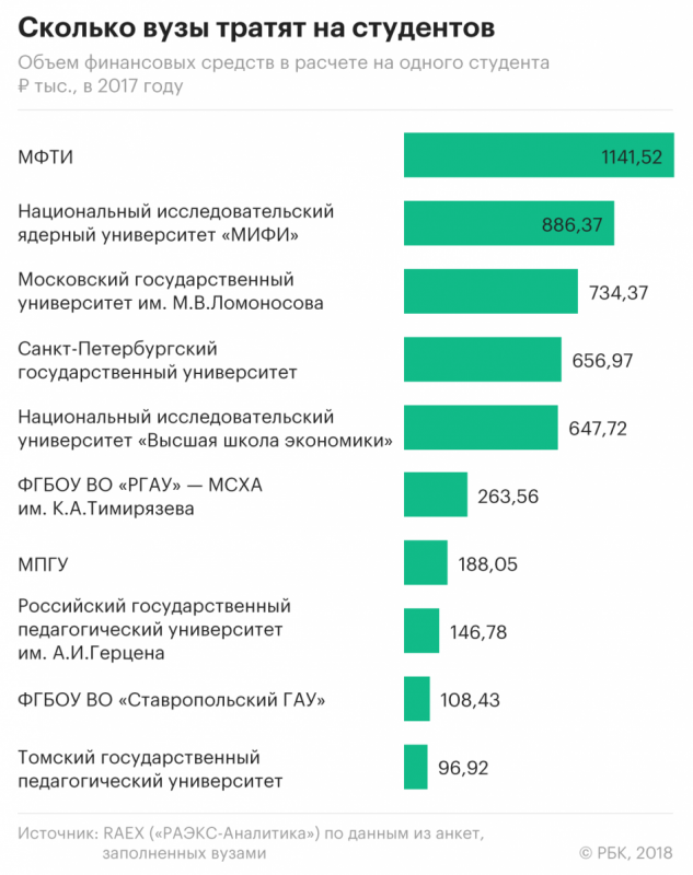 По данным рейтингового агентства, объем финансовых средств на одного студента в РГПУ им. Герцена в 2017 году составил 146,78 тыс. руб., МПГУ — 188,05 тыс. руб., Томского педвуза — 96,92 тыс. руб., Ставропольского ГАУ — 108,43 тыс. руб., Тимирязевки — 263,56 тыс. руб. В так называемых рейтинговых вузах (топ-5 рейтинга RAEX) средний объем затрат на одного учащегося составляет более 640 тыс. руб.