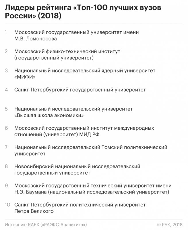 В первой пятерке лучших российских университетов оказались МГУ им. Ломоносова, МФТИ, НИЯУ МИФИ, СПБГУ и НИУ ВШЭ. Из педагогических университетов в сотню рейтинга попали петербургский РГПУ им. Герцена (42-е место) и столичный МПГУ (49-е место), а также Томский государственный педагогический университет (75-е место). Из аграрных — Ставропольский ГАУ (65-е место) и РГАУ — МСХА имени К. А. Тимирязева (86-я строчка рейтинга).