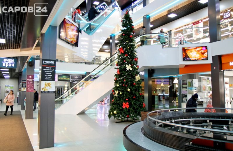 Традиционно украшенные елки устанавливает в Сарове ТЦ «Атом». Одна новогодняя красавица переливается огнями на перекрестке улиц Силкина и Духова. Вторая, шестиметровая елка создает праздничную атмосферу и радует саровчан в торговом центре.