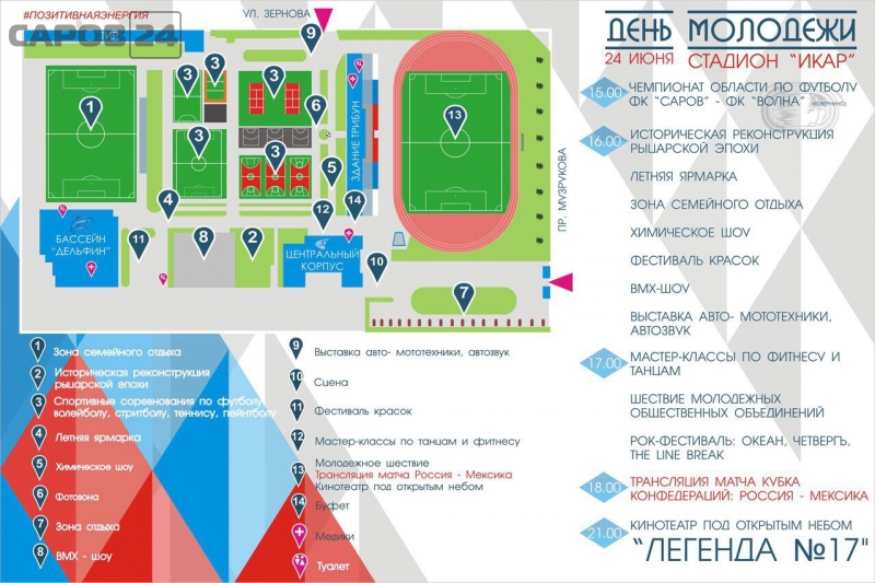 24 июня саровчане отметят День молодежи на стадионе "Икар" и в парке имени Зернова. В 15:00 на центральном футбольном поле стадиона начнется матч в рамках Первенства Нижегородской области по футболу между командами ФК "Саров" и ФК "Волна" (Ковернино). В 16:00 заработают различные зоны отдыха: историческая с антуражем рыцарской эпохи, семейная, научная, духовная, зона мастеров, зона современных настольных игры. Зрители увидят выставку автомобилей и мототехники, соревнования по автозвуку, фигурному вождению мотоцикла и BMX-шоу. Хореографы и фитнес-инструкторы проекта «Танцующий Саров» проведут мастер-классы для всех желающих. Самые сильные жители города смогут принять участие в соревнованиях по кросс-фиту, самые меткие - в соревнованиях по пейнтоболу, самые смелые - в фестивале красок.
