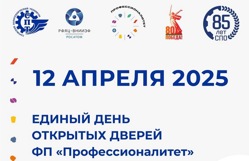 В субботу, 12 апреля, в 9:30 в Саровском политехническом техникуме имени Б. Г. Музрукова пройдет единый день открытых дверей федерального проекта «Профессионалитет».