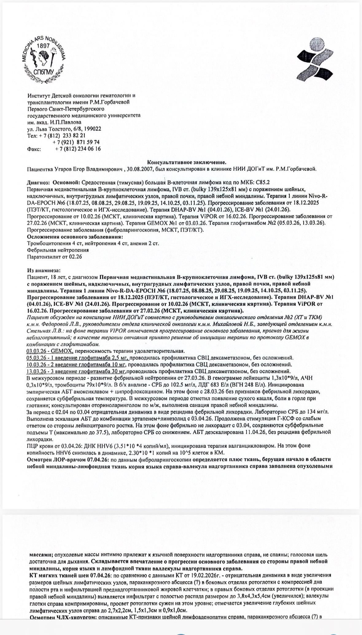 18-летний саровчанин Егор Угаров борется с ужасным заболеванием, онкологией 4 стадии (В-клеточная лимфома). Опухоль неоперабельна.