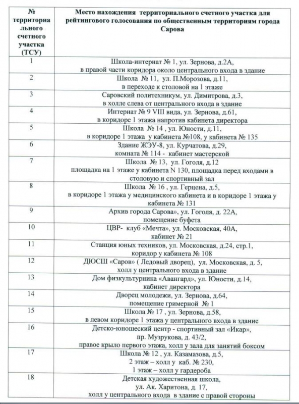 Саровчане смогут проголосовать максимум за две территории из шести: парк имени Зернова, парк на улице Сосина, бульвар в МКР № 15, бульвар в МКР № 22, лыжная база, зона отдыха у пруда Борового. Жители города от 14 лет и старше смогут проголосовать на любом участке из 30, независимо от места прописки. Итоги подведут в течение 10 дней. Набравший наибольшее число голосов проект реализуют уже в этом году.