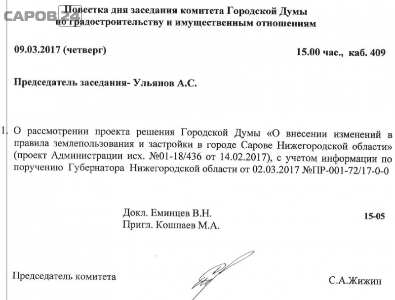 Как сообщает сайт городской думы, депутаты 9 марта на заседании комитета по градостроительству и имущественным отношениям рассмотрят один проект решения «О внесении изменений в правила землепользования и застройки в Сарове». Вопрос рассмотрят с учётом информации по поручению губернатора Валерия Шанцева. Комитет начнется в 15:00 в кабинете 409 (4 этаж).
