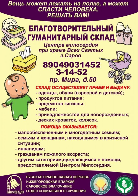 Гуманитарный склад Саровского благочиния готов предоставить нуждающимся одежду и обувь для детей и взрослых, канцелярские товары, игрушки для детей, сообщает сайт «Православный Саров». По заявкам выдаются детские кроватки и коляски, средства гигиены и ухода за детьми. Семьям оказывают и другую помощь (мебелью, предметами быта). В очень тяжелой ситуации семьям выдают продуктовые наборы. Есть возможность получить бесплатную помощь юриста — по предварительной договоренности.