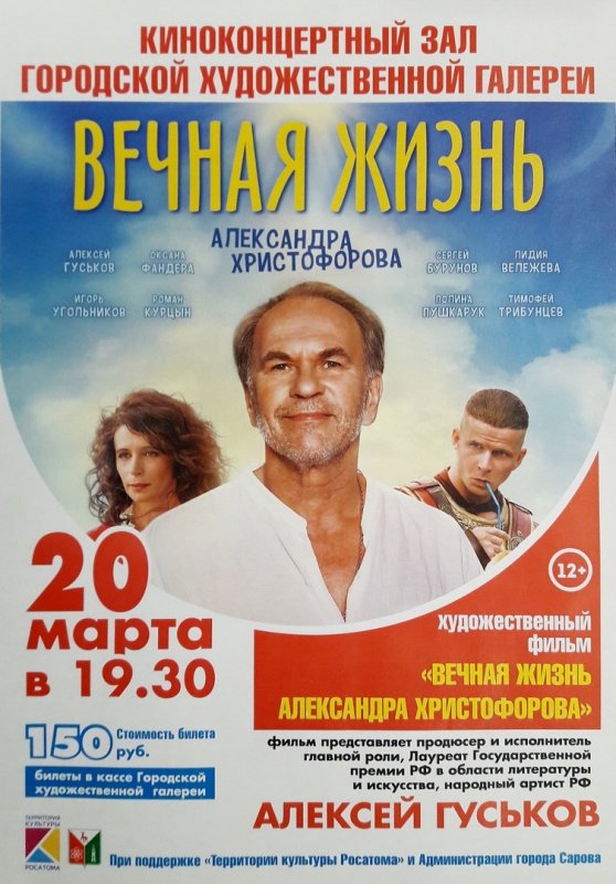 20 марта в 19:30 в Городской художественной галерее пройдет показ новой отечественной комедии «Вечная жизнь Александра Христофорова». Фильм представит продюсер и исполнитель главной роли, народный артист России Алексей Гуськов. Встреча состоится при поддержке программы «Территория культуры Росатома».