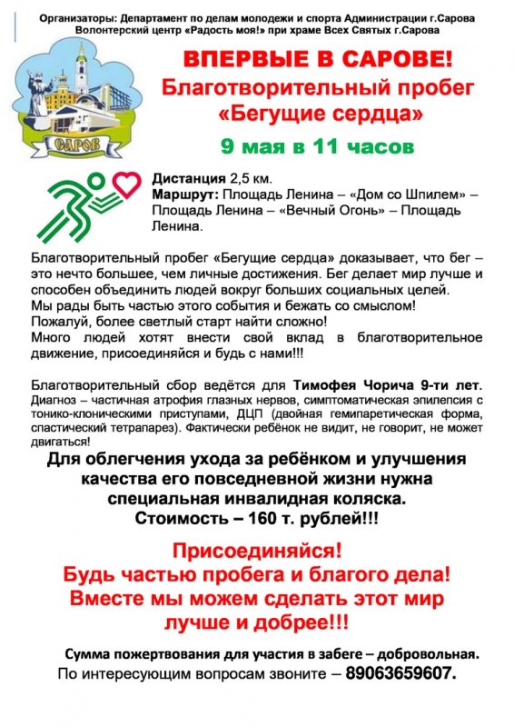 Департамент по делам молодежи и спорта и православный волонтерский центр «Радость моя!» приглашают горожан принять участие в благотворительном легкоатлетическом забеге «Бегущие сердца».