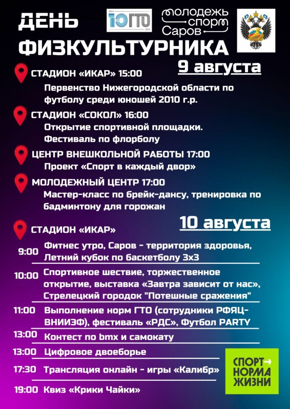 9 и 10 августа на стадионах «Икар», «Сокол», площадках Центра внешкольной работы и Молодежного центра пройдет День физкультурника.Саровчан ждут соревнования по флорболу, баскетболу, футболу, мастер-класс по брейк-дансу, музыкальный квиз «Крики чайки», выставка «Завтра зависит от нас» и многое другое.Источник: департамент по делам молодежи и спорта Сарова