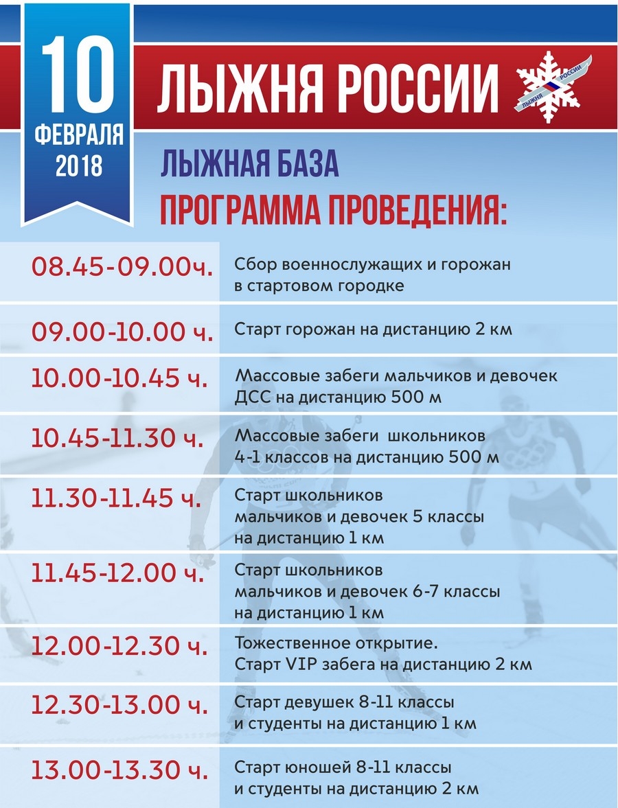 Департамент по делам молодежи и спорта приглашает всех желающих на традиционный спортивный праздник «Лыжня России – 2018», который пройдет 10 февраля с 9:00 на Лыжной базе. На празднике будут работать игровые интерактивные площадки, а также выступать творческие коллективы.