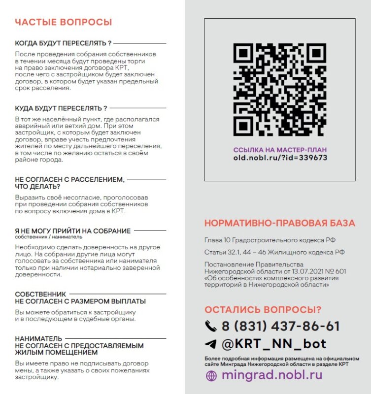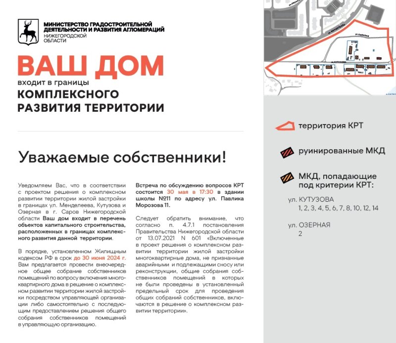 30 мая в здании школы № 11 на улице Павлика Морозова состоится собрание собственников домов, попадающих в границы зоны комплексного развития территории. Это дома № 1 – 8, 10, 12, 14 по улице Кутузова и дома № 2 по улице Озерной.На встрече специалисты разъяснят порядок действия программы и механизмы участия или неучастия в ней. Начало в 17:30.Ответы на наиболее популярные вопросы можно получить из буклетов во вложении.Подробно с проектом комплексного развития этой территории можно ознакомиться также на официальном сайте администрации: https://adm-sarov.ru/about/information/anons/22605/Суть проекта – в расселении жилых домов и строительстве на этом месте современного микрорайона. Окончательное решение о включении или невключении дома в зону КРТ целиком в руках собственников жилья и принимается на общем собрании, сообщает департамент архитектуры и градостроительства администрации Сарова.